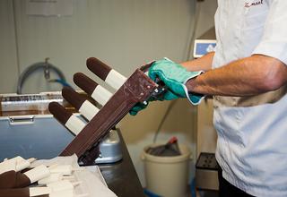 Faites preuve de créativité avec le chocolat. On combine plusieurs couleurs de chocolat sur un seul bâtonnet glacé. Pour travailler le chocolat de la meilleure manière, utilisez un bain-marie, de préférence sans eau. Surprenez vos clients en glissant une surprise dans la glace (p.ex. un fourrage croustillant ou une mousse).